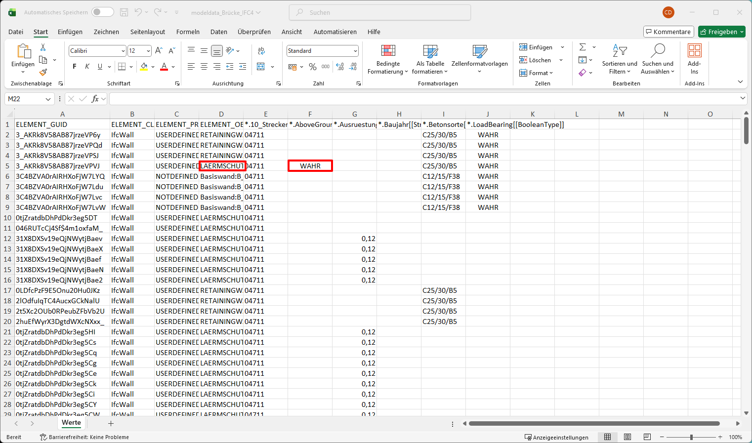 Besonders wichtig ist die Spalte ELEMENT_GUID: Sie dient zur eindeutigen Identifikation des Bauelements und