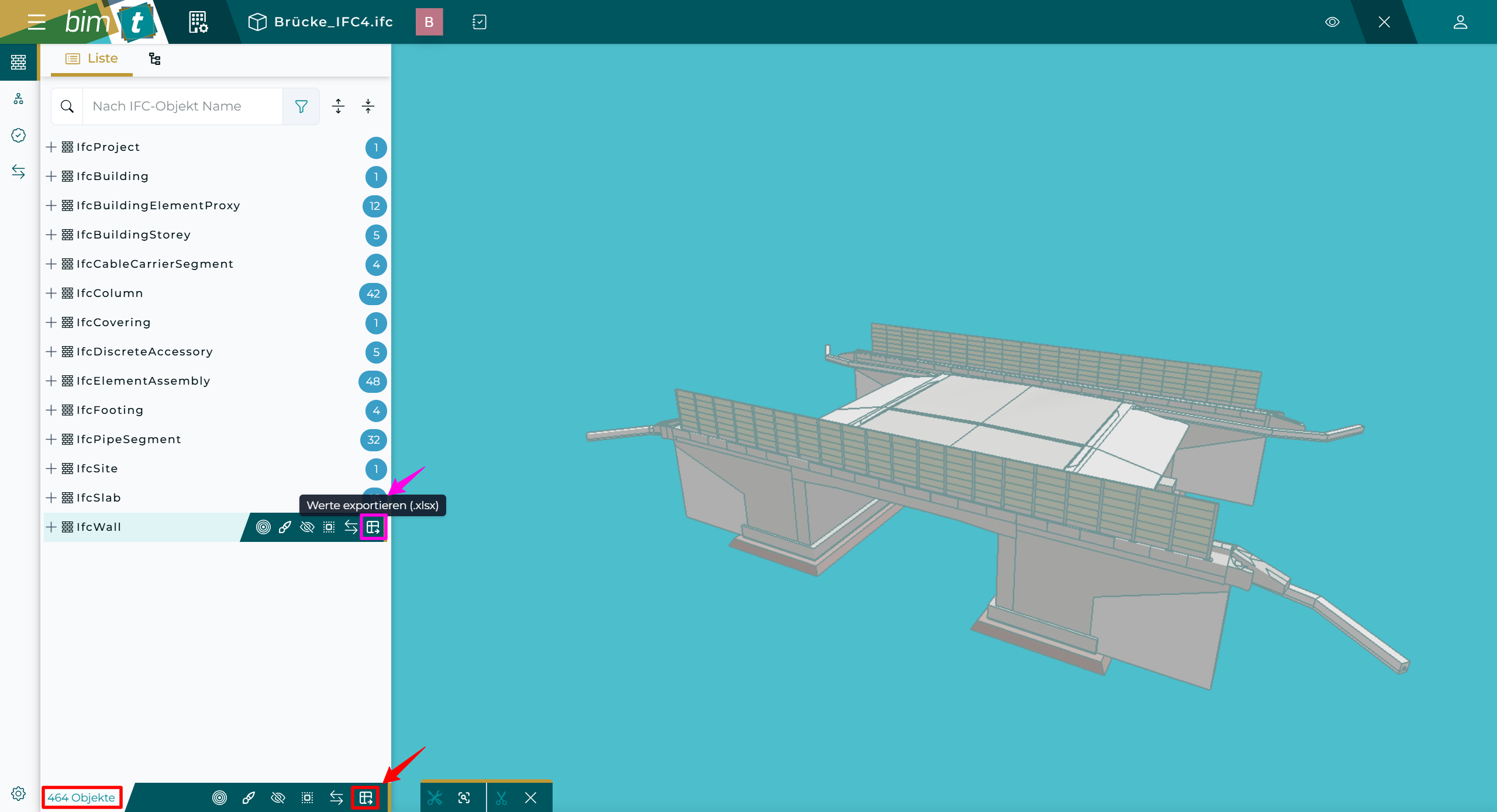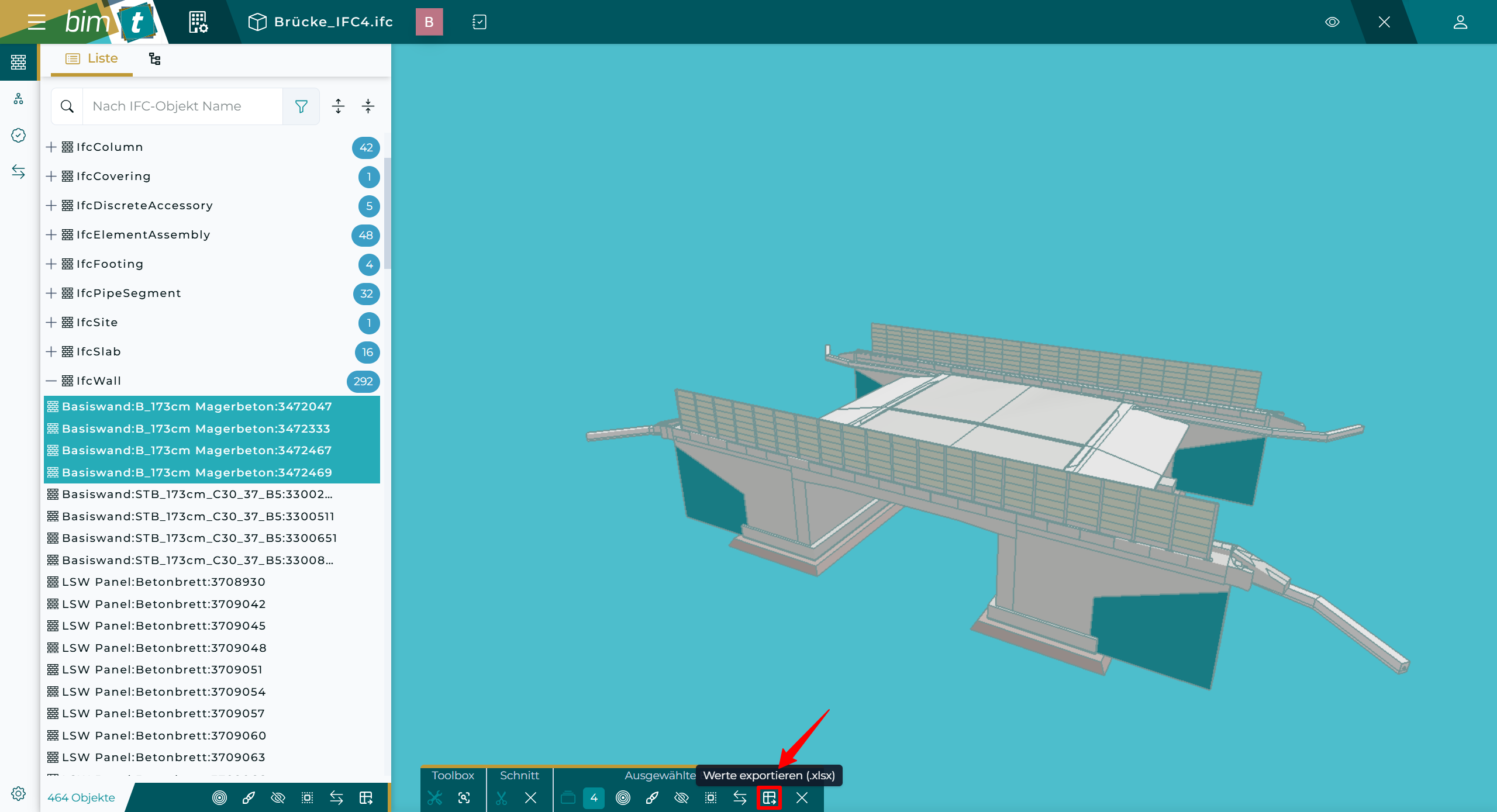 IFC-Klasse und klicken Sie auf Werte exportieren (.xlsx) (im Bild lila markiert). Alternativ können Sie auch