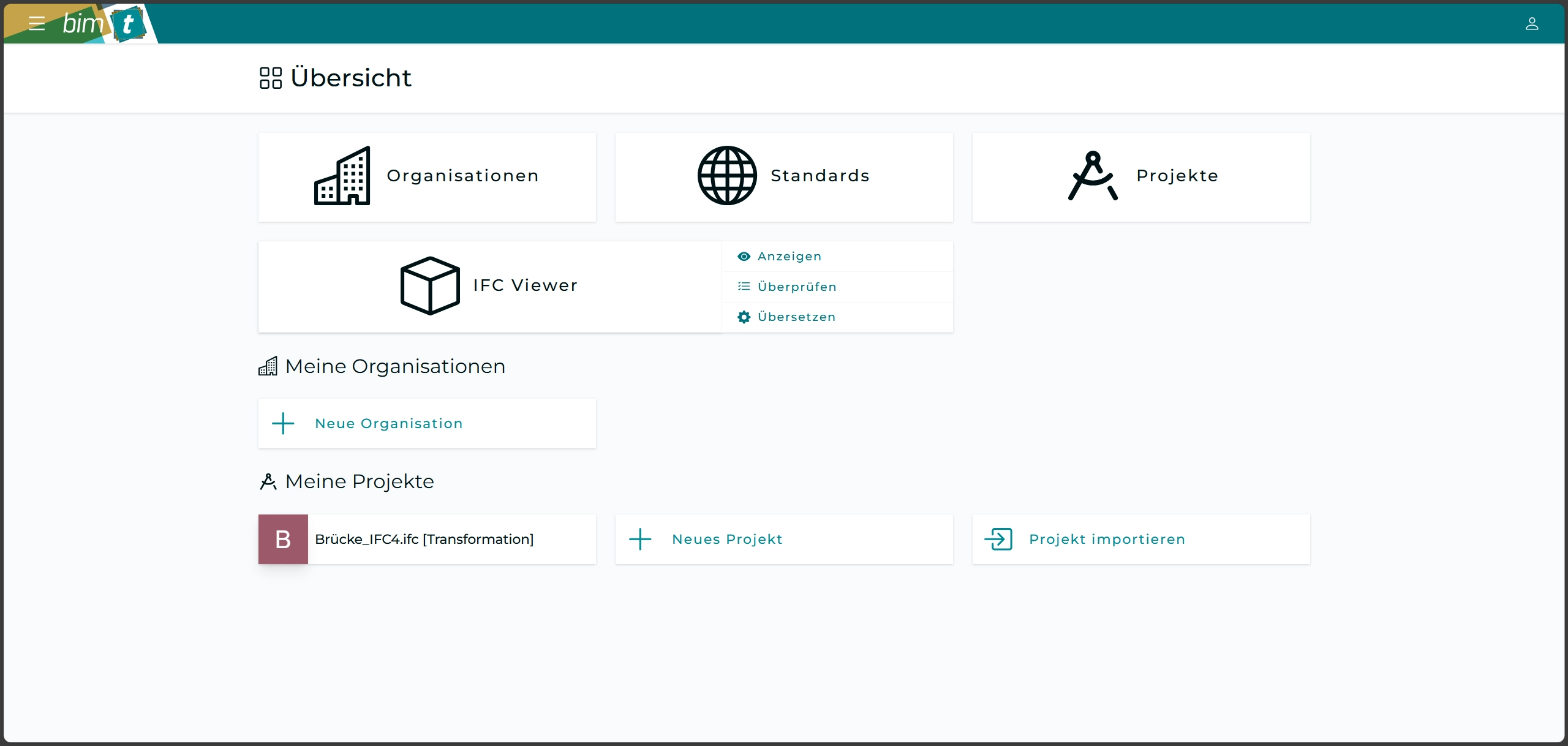 Das Dashboard ist Ihr Ausgangspunkt für alle Vorgänge, die Sie mit dem Merkmalservice durchführen möchten. Hier haben sie oben den Navigationsbereich, wo sie zu Organisationen, Standards, Projekte oder dem IFC-Viewer wechseln können. Darunter Befindet sich eine Übersicht über ihre Organisationen und Projekte.