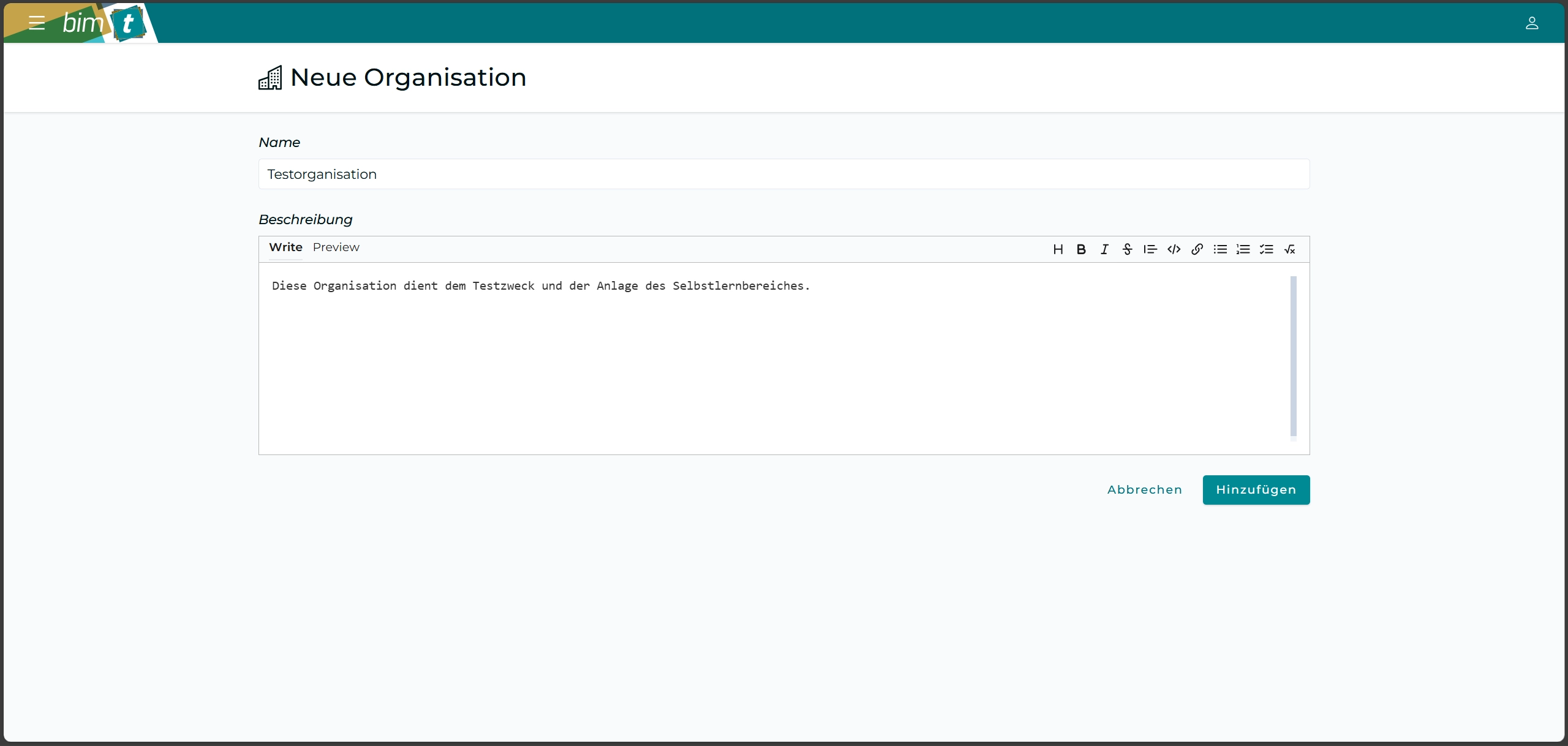 Benennen Sie nun Ihre Organisation. Sobald Sie einen passenden Namen gefunden haben können Sie die Erstellung mit einem Klick auf “Hinzufügen” bestätigen.
