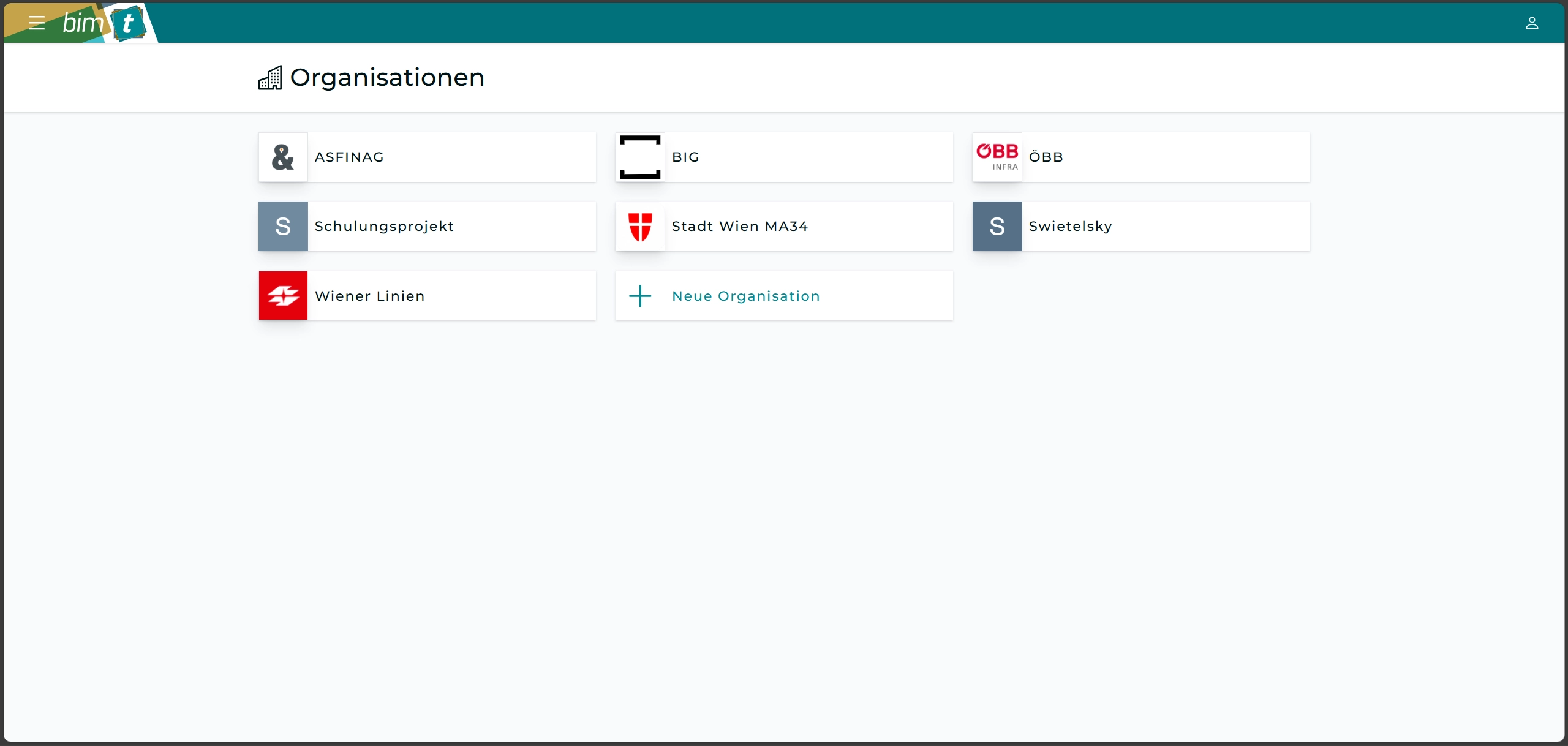 Hier werden Ihnen alle vorhandenen Organisationen angezeigt. Klicken sie auf “Neue Organisation” um eine Organisation zu erstellen.