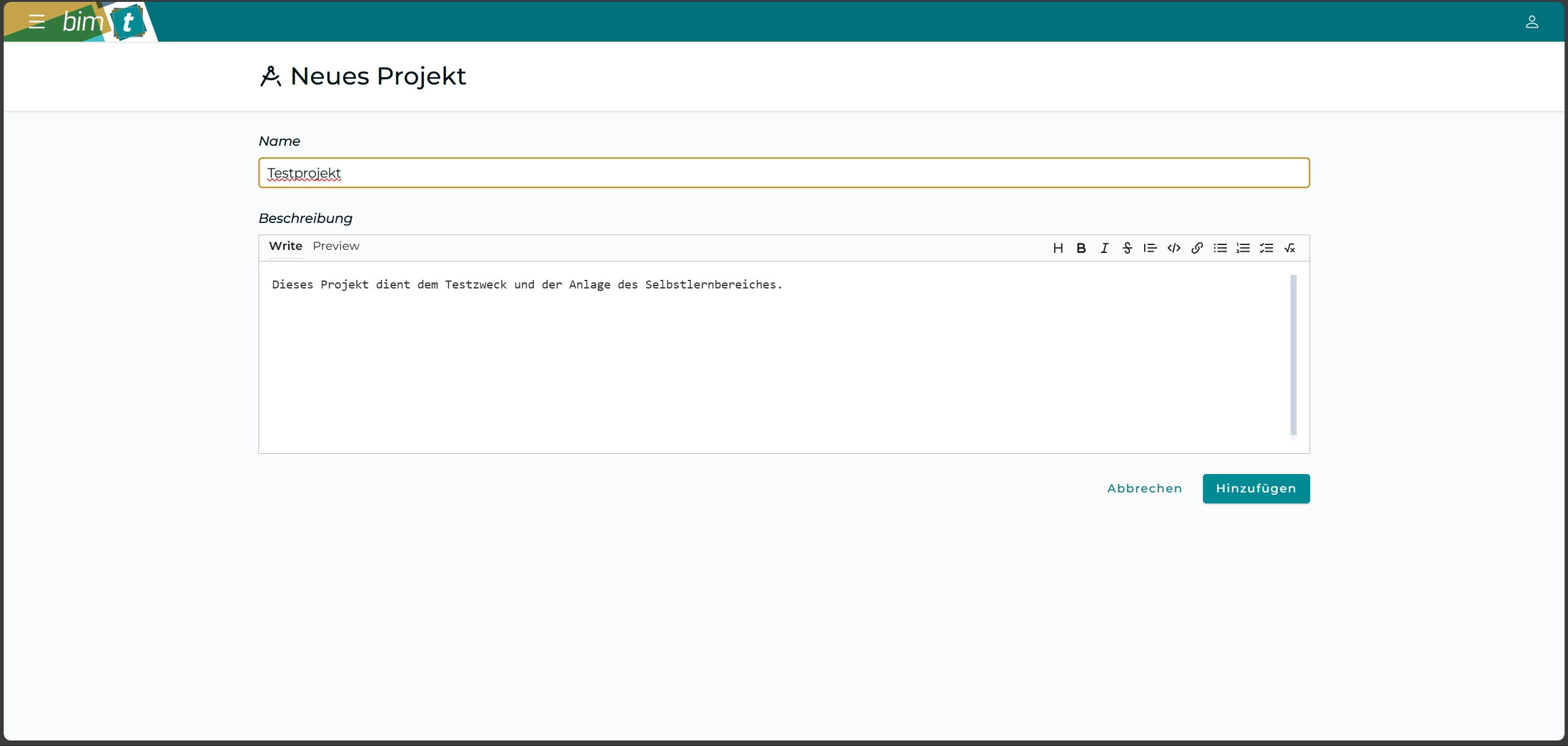 Benennen Sie nun Ihr Projekt. Sobald Sie einen passenden Namen gefunden haben können Sie die Erstellung mit einem Klick auf “Hinzufügen” bestätigen.