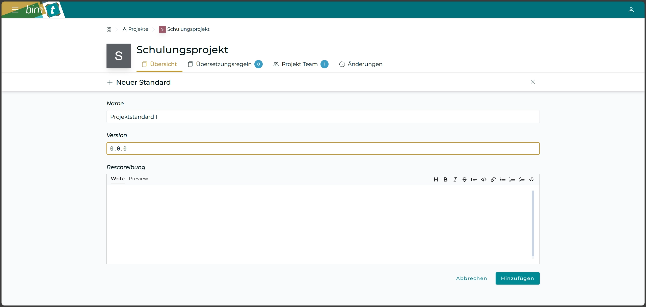 Sobald Sie auf “Neuer Standard” oder “Neuer Projektstandard” geklickt haben, werden Sie zur Erstellung weitergeleitet. Hier können Sie dem Standard einen Namen, eine Version und eine Beschreibung geben. Die Versionsnummer hat dabei immer drei Zahlen zu beinhalten welche mit Punkten getrennt sind. z.B. 0.1.0 Wenn Sie nun einen passenden Defintionen getroffen haben, kann der Standard mit einem Klick auf “Hinzufügen” erstellt werden.