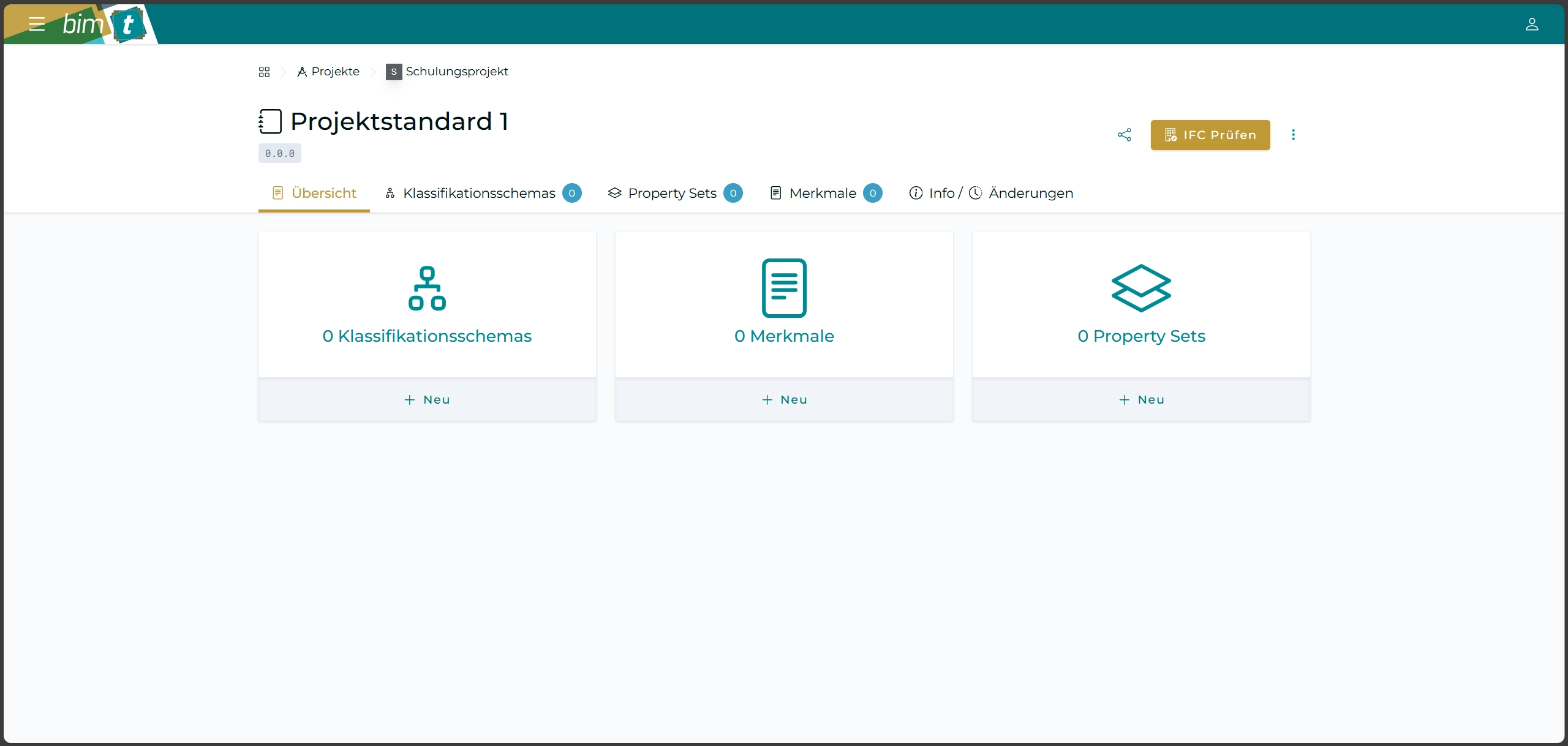 Nach der Erstellung wird die Detailansicht des Standards gezeigt. Hier können sie nun die Inhalte des Standards bearbeiten. Es gibt die Möglichkeit, Merkmale, Property Sets und Klassifikationsschema zu erstellen. Wenn sie die Konfiguration ihres Standards abgeschlossen haben können sie IFC-Modelle validieren oder übersetzen.